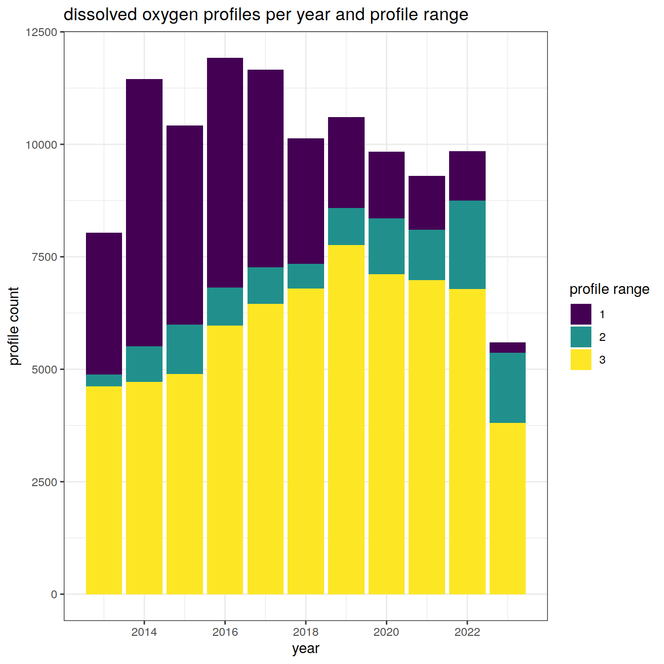 labs(title = "dissolved oxygen profiles per year and profile range",